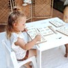 Tablice grafomotoryczne są wykonane z trwałego, laminowanego materiału, który pozwala na wielokrotne korzystanie z nich. Wymiary tabliczek zostały odpowiednio dostosowane, aby były łatwe do trzymania w rękach małych dzieci i mogły być używane zarówno na stole, jak i na płaskiej powierzchni.
